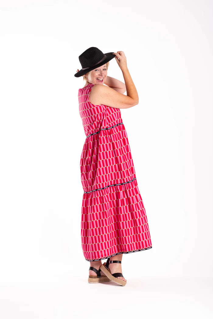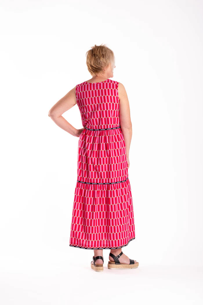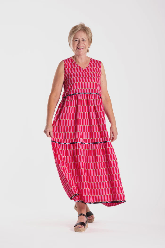 This tiered vee neck, sleeveless dress is comfortable and beautiful, thanks to its soft hanging fabric. Dress it up with a pair of heels or wear it with sandals for a day in the sun!