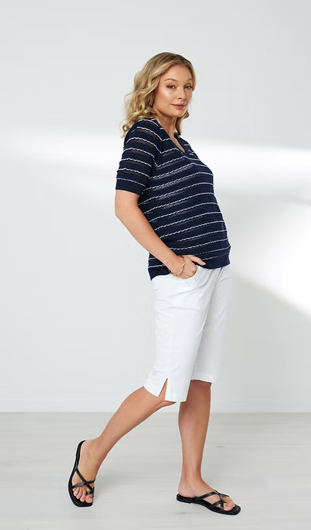 100% Cotton V neck light weight summer knitted top. Full body has crochet pattern with contrast colour scallop stripes. Short sleeves. Rib at sleeve cuff and body hem.